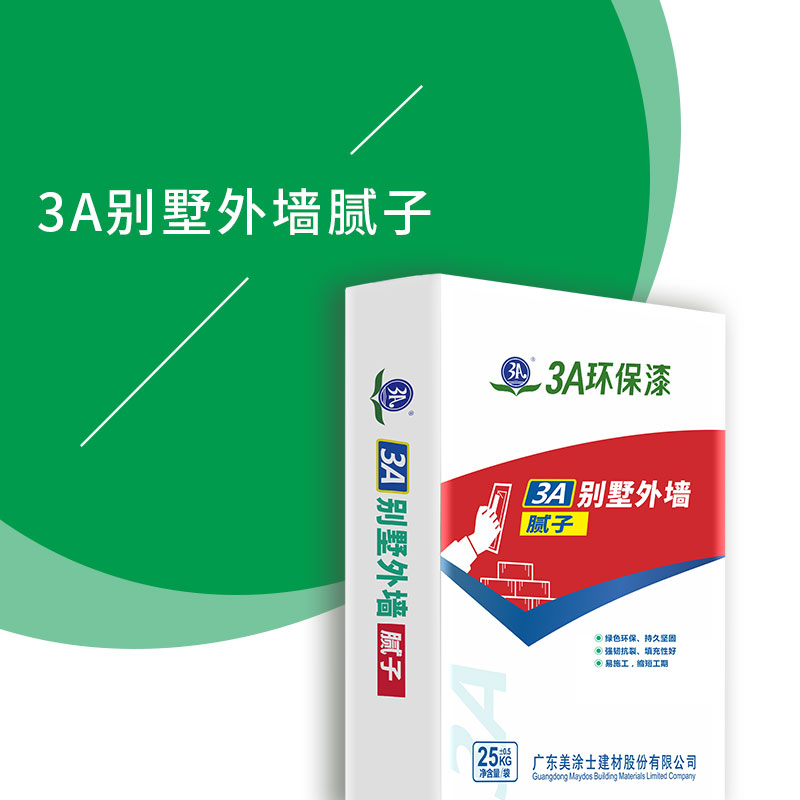 3A別墅外墻膩子,采用高聚合物,無機粘結力料及精選強度增加劑配制而成。加入拌合劑后,將發生適中的化學反應,生成分子結構很小的凝結體,增加分子間的聚合力,使得產品具有高強度,透水率小、附著力佳及封閉性優等特點。