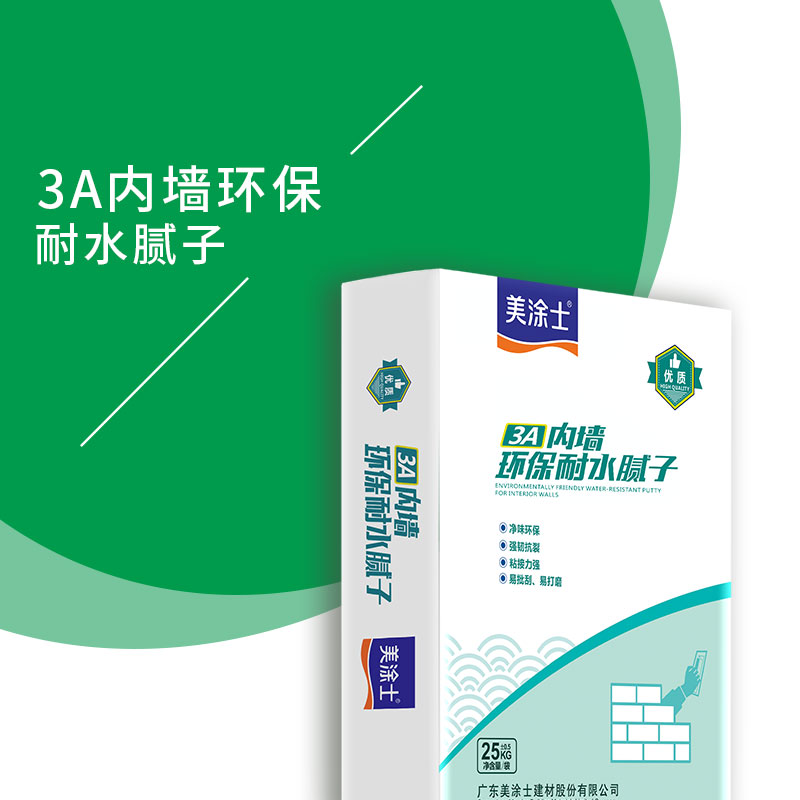 3A內墻環保耐水膩子采用高聚合物、無機粘結力料及精選強度增加劑配制而成。加入拌合劑后,將發生適中的化學反應,生成分子結構很小的凝結體,增加分子間的聚合力,使得產品具有強度高、透水率低、附著力強及封閉性優等特點。