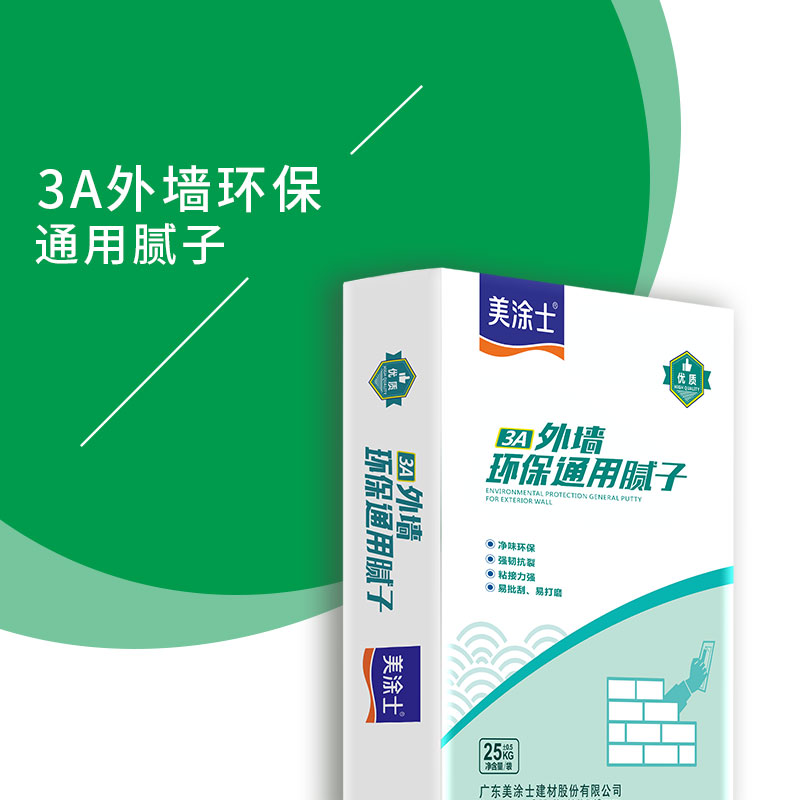 3A外墻環保通用膩子,采用高聚合物,無機粘結力料及精選強度增加劑配制而成。加入拌合劑后,將發生適中的化學反應,生成分子結構很小的凝結體,增加分子間的聚合力,使得產品具有高強度,透水率小、附著力佳及封閉性優等特點。